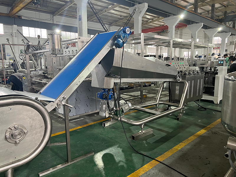 As linhas de produção de doces estão equipadas com sistemas essenciais, como sistema de cozimento contínuo, mesa de resfriamento, rolo de batelada (com controle de temperatura), calibrador de cordão, máquina de moldagem de alta velocidade, túnel de resfriamento e máquina de embalagem totalmente automática. Esses sistemas abrangem todo o processo, desde o cozimento da calda, moldagem, resfriamento e modelagem até a embalagem do produto acabado.